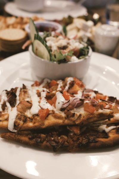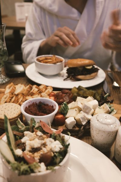 Pour commencer notre repas, nous avons choisi de partager un plateau de fromages qui comprenait une bonne variété de fromages, de cornichons, de pâtes à tartiner et de crackers. Pour nos plats, mon mari a commandé l'Arctic Burger, composé d'une galette d'angus AAA, de Skyr à l'ail, de havarti, d'oignons grillés, de chou braisé et d'un glaçage BBQ, le tout accompagné de frites. J'ai opté pour le pain plat au poulet avec du poulet grillé à la flamme, du bacon, des tomates cerises, des oignons rouges, du glaçage BBQ, du ranch et de la mozzarella, et une salade d'accompagnement. Comme toujours, nous avons pris des bouchées de nos commandes respectives et nous avons tous deux apprécié les saveurs vibrantes et les portions solides de nos repas.