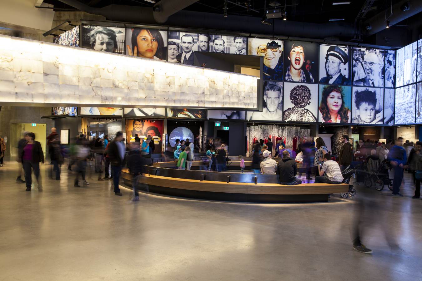 Seul musée au monde entièrement consacré à la sensibilisation et à l'éducation aux droits de l'homme, il constitue un phare pour les visiteurs du monde entier. Des rampes d'albâtre incandescent sillonnent les galeries conçues pour interpeller, motiver et élever. Des expositions multisensorielles explorent les concepts des droits de l'homme à l'échelle internationale, mais à travers une lentille canadienne unique.