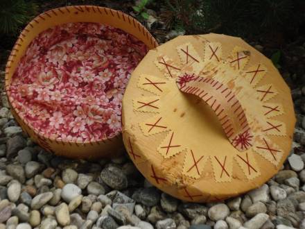 Nous faisons de notre mieux pour respecter l'environnement et c'est pourquoi nous récoltons l'écorce de bouleau pendant que nous coupons le bois de chauffage. Cela nous sert à deux fins : premièrement, nous utilisons chaque point d'écorce de l'arbre que nous coupons et deuxièmement, le bois est ensuite distribué dans toute la communauté pour être utilisé par ceux qui ont des poêles à bois pour chauffer leurs maisons. Nous pouvons fabriquer environ 10 grands paniers à partir d'un seul arbre, en fonction de sa taille. De plus, l'écorce du bouleau ne peut être facilement enlevée qu'au printemps et au début de l'été. C'est pourquoi nous ne fabriquons qu'une quantité limitée de paniers chaque année. Cette année, nous estimons que nous allons abattre environ 15 à 20 bouleaux, ce qui représente moins de deux cordes de bois.