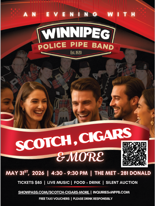 Venez profiter de la musique de la fanfare de la police de Winnipeg, d'une dégustation de scotch, d'un cigare offert, d'amuse-bouches, de haggis et des lots de la vente aux enchères silencieuse.