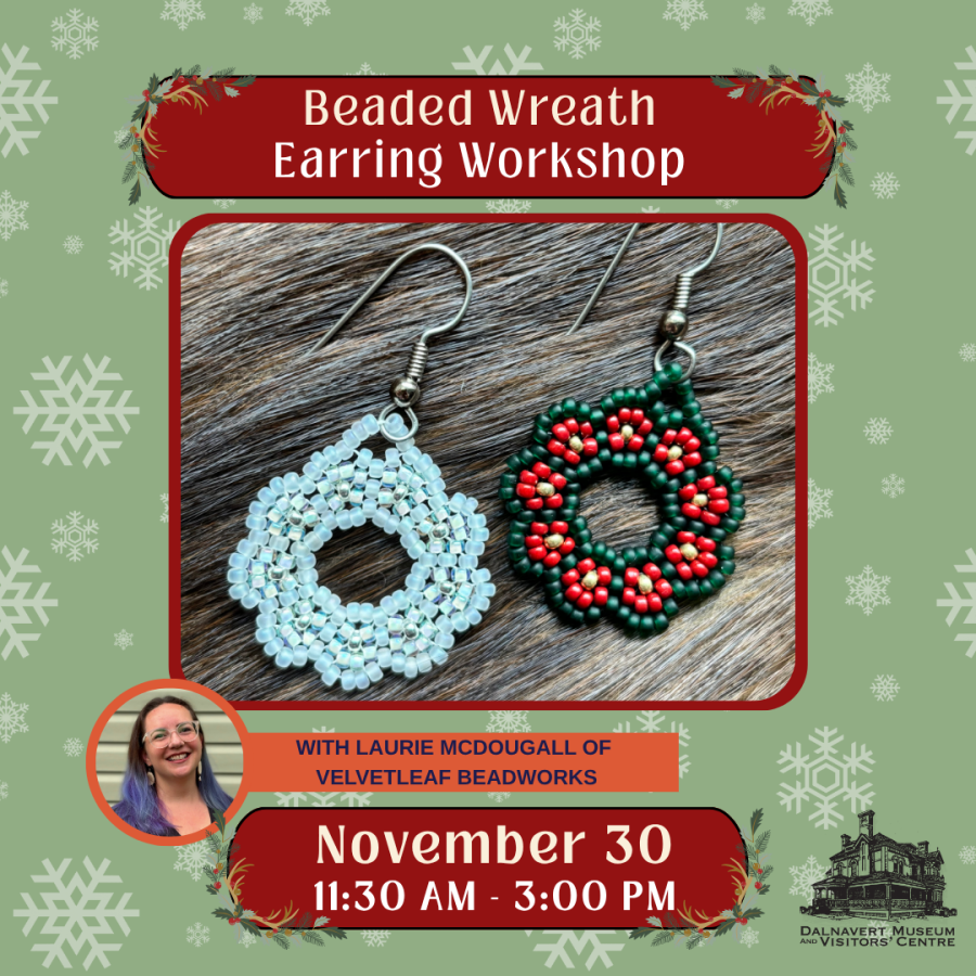Rendez-vous au musée Dalnavert pour un atelier de perlage avec Laurie McDougall de Velvetleaf Beadworks. Apprenez à fabriquer une paire de boucles d'oreilles en forme de couronnes festives (soit dans le vert et le rouge traditionnels de Noël, soit dans un blanc hivernal et glacial), l'accessoire parfait pour toutes vos festivités saisonnières ou un cadeau attentionné pour quelqu'un de spécial.