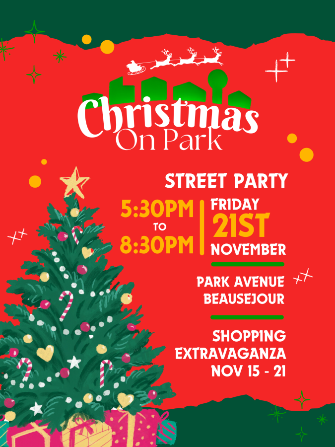 Participez au Shopping Extravaganza la semaine précédant la fête de rue pour profiter de bonnes affaires et de prix à gagner dans les commerces de la communauté. Pour plus d'informations, visitez notre page Facebook Christmas on Park ou envoyez un courriel à christmasonpark@gmail.com.