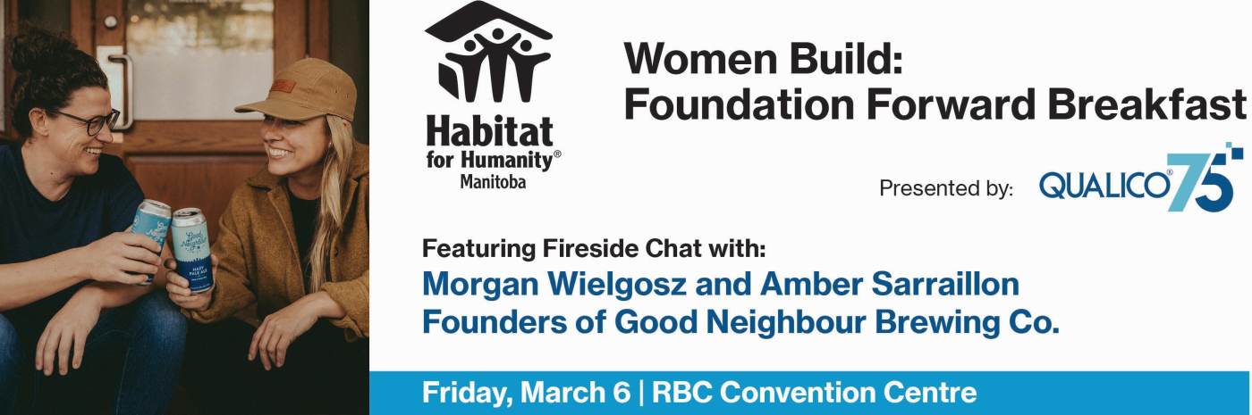 Joignez-vous à nous pour le petit-déjeuner Women Build: Foundation Forward organisé à l'occasion de la Journée internationale des femmes, le vendredi 6 mars 2026, au Centre des congrès RBC. Venez déguster un délicieux petit-déjeuner buffet et écouter deux femmes inspirantes de notre communauté, Morgan Wielgosz et Amber Sarraillon, fondatrices de la première brasserie entièrement féminine et détenue et exploitée par des personnes 2SLGBTQ+ au Manitoba, Good Neighbour Brewing Co.