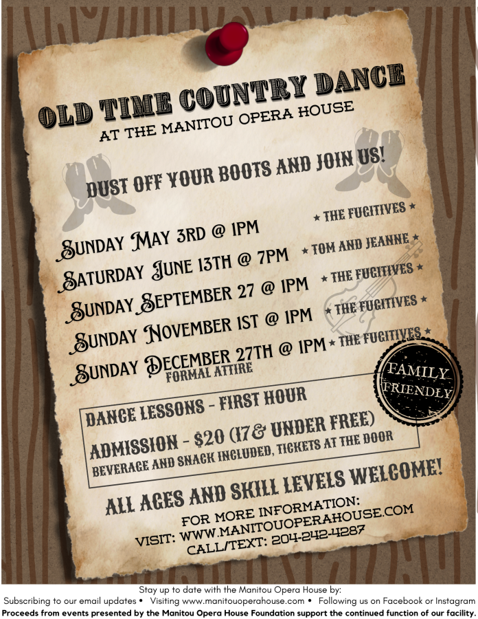 Rejoignez-nous à l'Opéra de Manitou pour un après-midi de musique live, de danse endiablée et de charme provincial. Que vous soyez un danseur chevronné du two-step ou que vous ayez deux pieds gauches, notre cours de danse de 13 h à 14 h vous mettra en confiance avant l'ouverture de la piste de danse à 15 h.