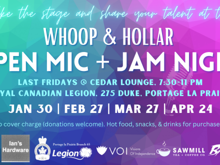 QUOI ? Musique. Comédie. Théâtre. Hip-hop. Poésie. Tout ce que vous voulez ! Bienvenue à l'événement interactif de divertissement en direct de Portage la Prairie, dont vous êtes la vedette.