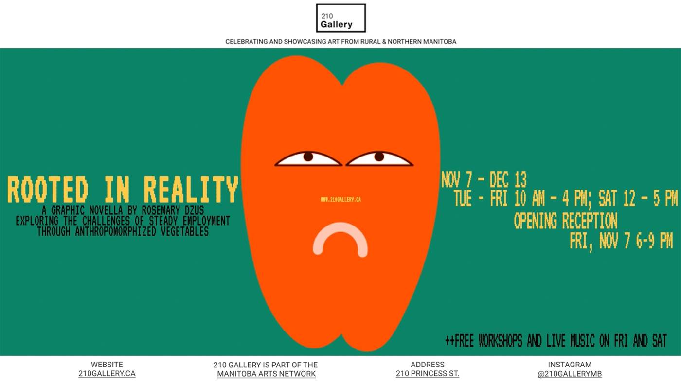 À quoi ressemble le travail précaire - pas seulement dans les gros titres ou les statistiques, mais dans le quotidien des personnes qui le vivent ? Rooted in Reality est une exposition de Rosemary Dzus basée sur un roman graphique qui illustre cette expérience par le biais d'un groupe de personnages inattendus : des légumes anthropomorphisés.