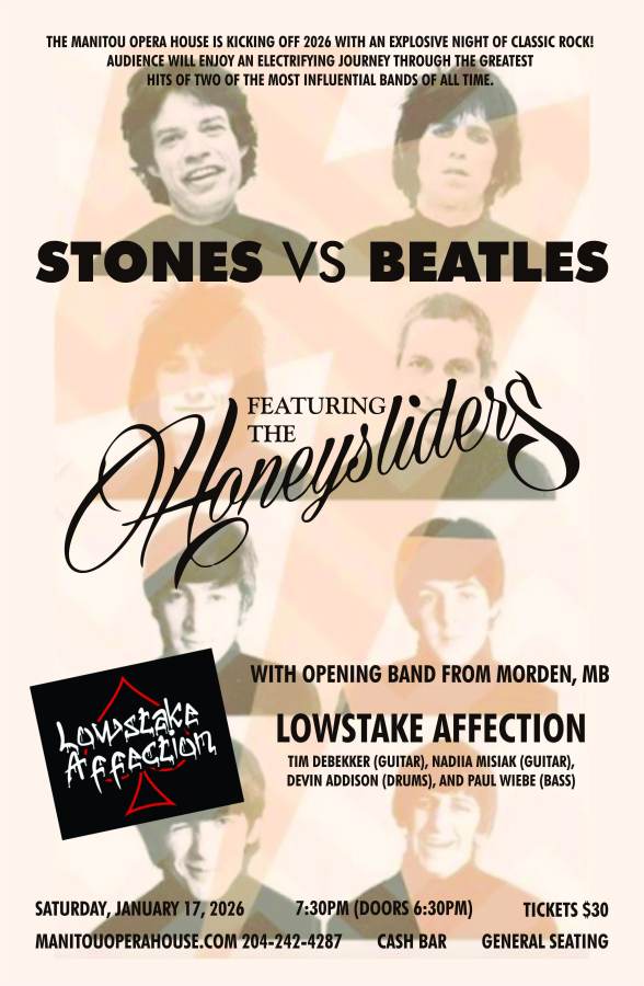 La Fondation Manitou Opera House présente Stones vs Beatles. Préparez-vous à une soirée rock 'n' roll épique avec The Honeysliders qui réunissent les plus grands succès des Beatles et des Rolling Stones dans un concert explosif. Avec leur mélange de country brut, de voix riches inspirées des prairies et de rock vintage, The Honeysliders offrent un spectacle nostalgique et énergique inspiré par The Band et Neil Young, une expérience qui transporte le public directement vers l'âge d'or du rock.
