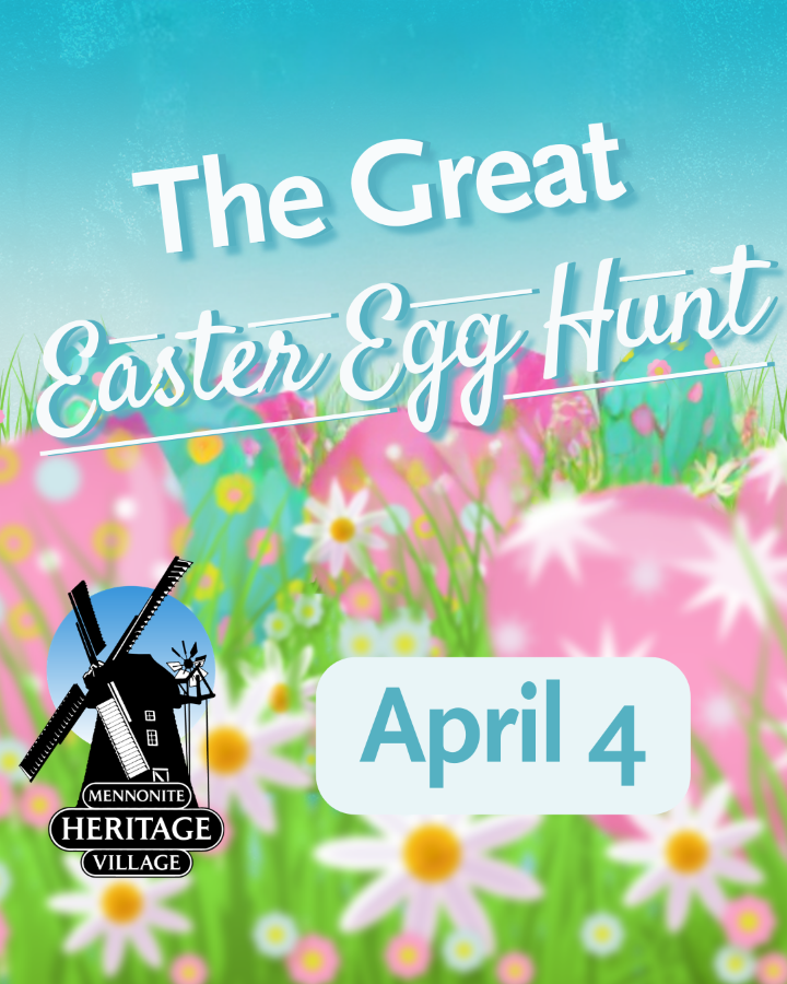 Nous sommes ravis de vous inviter à participer à la grande chasse aux œufs de Pâques annuelle au Mennonite Heritage Village, le samedi 4 avril, de 10 h à 14 h !